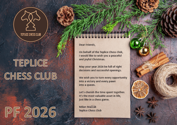 dovolte mi, abych vám jménem Teplice Chess Club popřál klidné a radostné prožití vánočních svátků. Ať je váš rok 2026 plný správných rozhodnutí a úspěšných zahájení. Přejeme vám, abyste každou příležitost proměnili ve vítězství a každého pěšce v dámu. Važme si společně stráveného času. Je to ta nejcennější hodnota v životě, stejně jako v šachové partii.