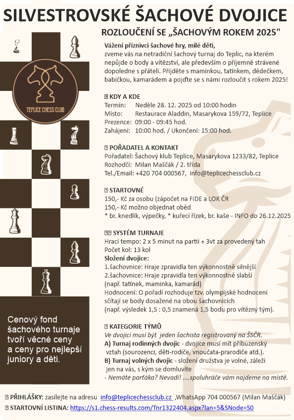 Vážení příznivci šachu, rodiče, junioři a milé děti, nejprve vám přeji klidné prožití svátečních dnů. Dovolte mi, abych Vás jménem Teplice Chess Club pozval na BLITZ turnaj šachových dvojic, který se uskuteční tuto neděli 28.12.2026 od 10:00 hodin v salónku Restaurace Aladdin v Teplicích. Přijďte se s námi společně rozloučit s rokem 2025. Jste všichni srdečně zváni. Více informací naleznete v přiloženém letáku. V případě objednání oběda nás kontaktujte nejpozději do 26.12.2025.